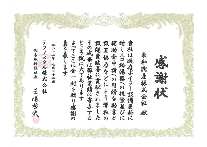 | 2014年 | 26年 | テクノメタル株式会社様感謝状授与 |